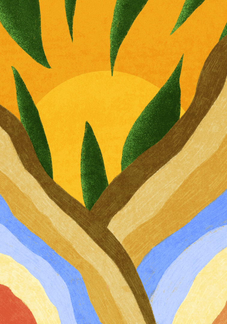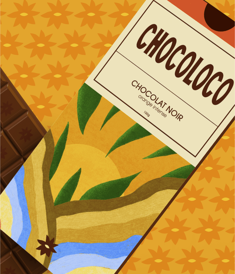 J'ai réalisé une illustration imparfaite pour mettre en avant l'artisanat, on peut voir les "coups de crayon" et de la texture. J'ai voulu illustrer de manière abstraite les lieux d'origine du cacaoyé, la chaleur, la végétation, la terre.
