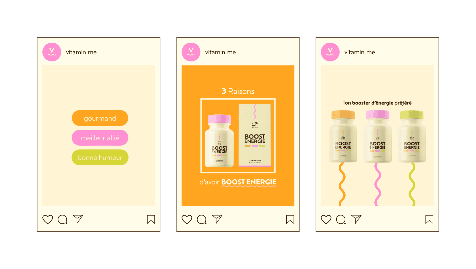 Pour représenter la marque et ses produits, j'ai créé un univers coloré, frais et dynamique, qui transmet l'énergie boostante que les gummies apportent à nos clientes.