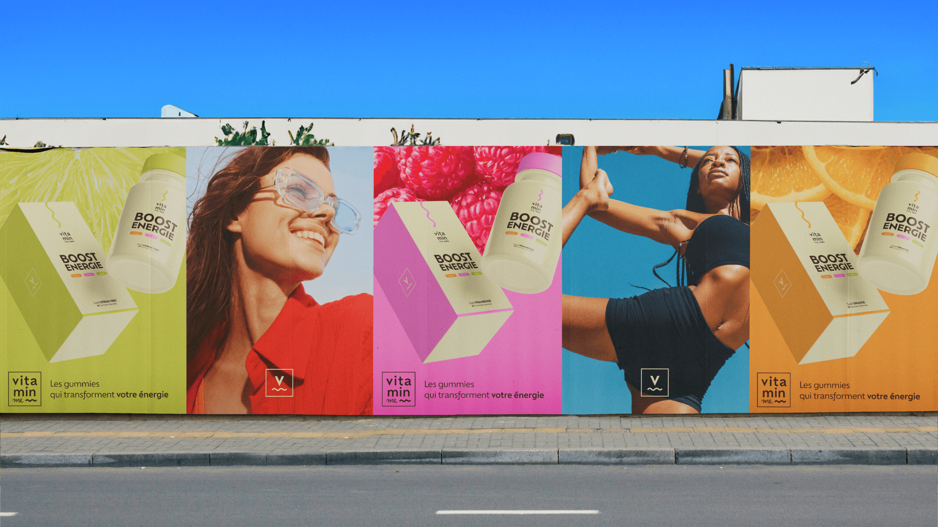 Affiches colorées, dynamique, les fruits chacun associés au goût des gummies rappellent les compléments naturels.